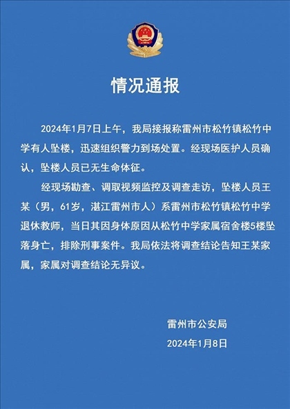 ·廣東湛江一中學(xué)老師墜樓,警方通報(bào):排除刑事案件。