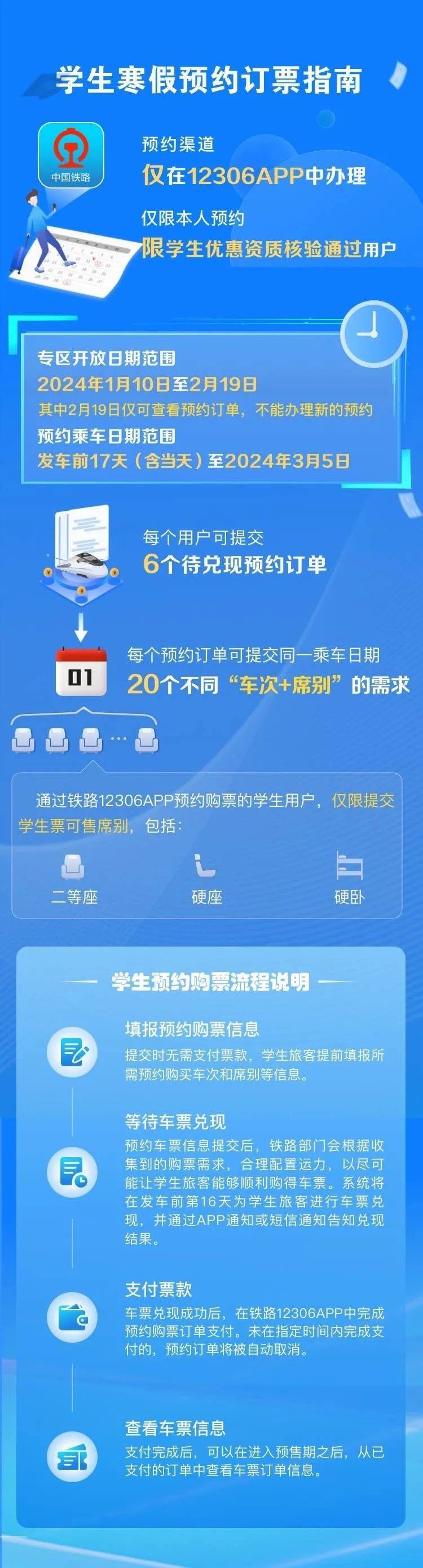 為認真貫徹落實黨中央國務院關于做好2024年元旦春節(jié)期間有關工作的要求,保障學生、務工人員等重點群體春運出行,鐵路12306創(chuàng)新服務舉措,為學生、務工人員推出了售票服務專區(qū)。自1月10日起,符合條件的學生旅客(已通過學生優(yōu)惠資質(zhì)核驗且有剩余優(yōu)惠乘車次數(shù))可通過“學生寒假訂票專項服務”專區(qū)預約購買春運期間(1月26日至3月5日)火車票,每名旅客最多可同時提交6個預約訂單,每個訂單可添加1個乘車日期的20個“車次+席別”的組合,可選席別為學生優(yōu)惠票適用的硬座、硬臥、二等座。已通過實名制核驗的務工人員可通過“務工人員春運預約訂票服務”專區(qū)預約購買春運期間火車票,每名旅客可同時提交6個預約訂單,每個訂單可選擇“時間+車次+席別”的1個組合。