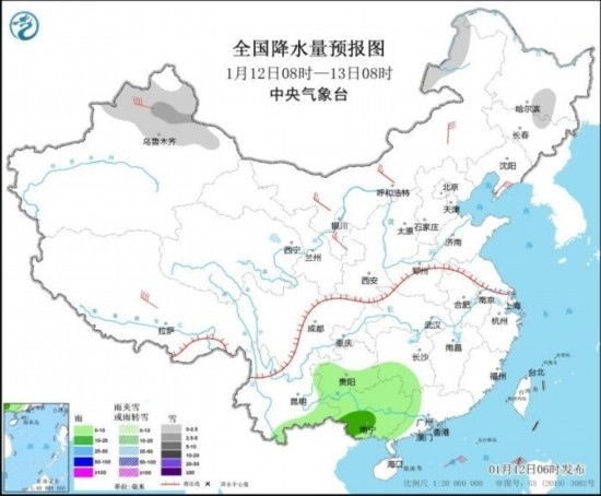 全國降水量預(yù)報圖(1月12日08時-13日08時)