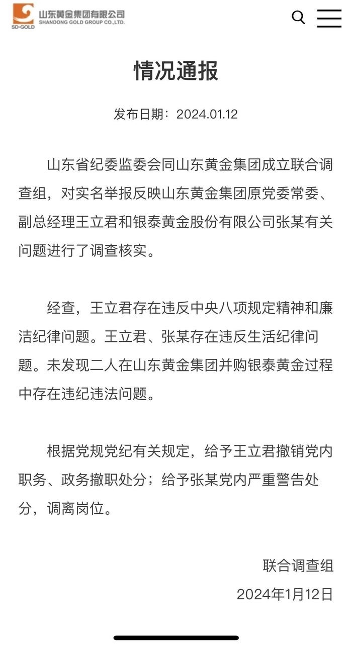 ·山東黃金集團(tuán)通報男子舉報妻子出軌國企領(lǐng)導(dǎo):給予王立君撤銷黨內(nèi)職務(wù)、政務(wù)撤職處分。