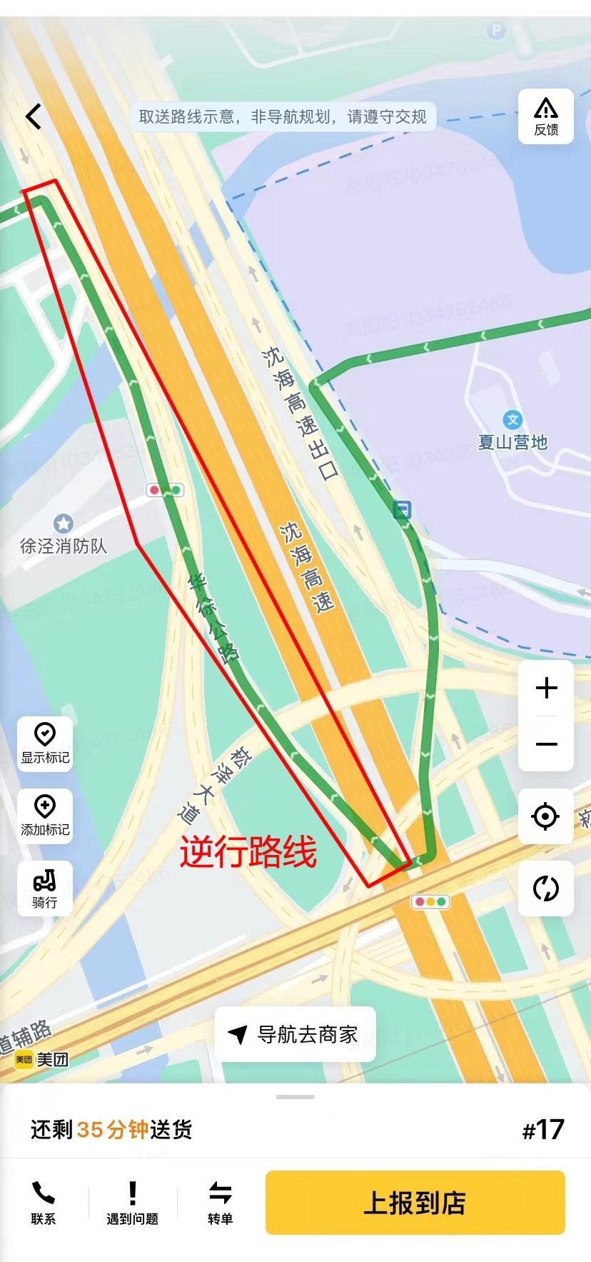 △陳陽陽提供的逆行路線截圖二:外賣平臺規(guī)劃了沿沈海高速西側(cè)華徐公路輔道由南向北騎行的逆行路線。
