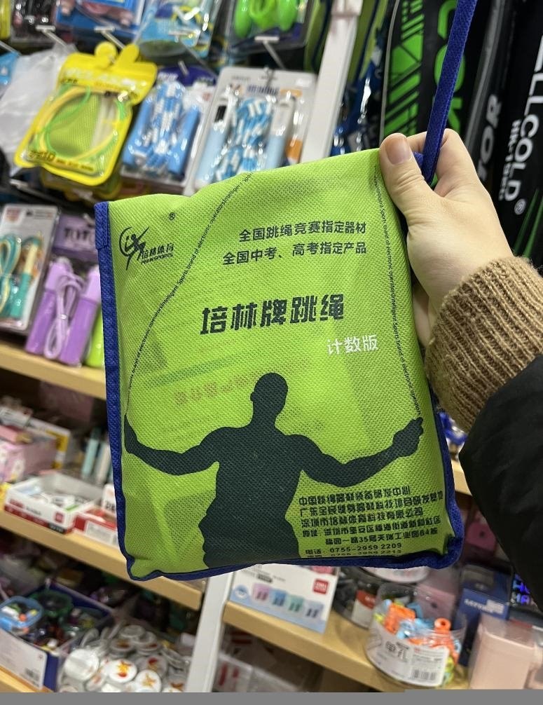 在重慶,記者以家長身份走訪主城區(qū)多家中學(xué)周邊文具店,問及是否售賣“中考跳繩”時(shí),多名店主不約而同向記者推薦同一品牌——培林牌跳繩。