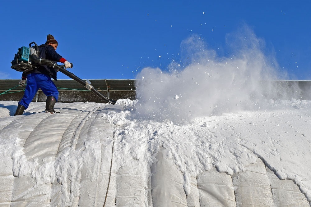 2023年12月17日,農民在山東省煙臺市福山區(qū)門樓街道用鼓風機清理暖棚上的積雪。新華社發(fā)(孫文潭攝)