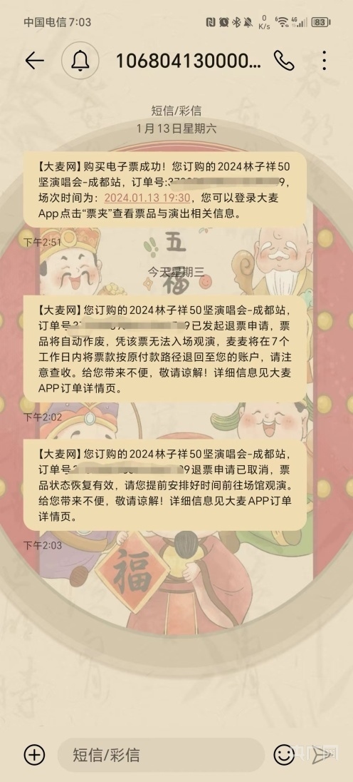 大麥網(wǎng)拒絕退票短信通知(周女士供圖)