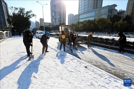 1月23日,在浙江省溫嶺市,人們?cè)谇宄访姹?。近日,受寒潮天氣影響,我?guó)多地迎來(lái)降溫降雪天氣,各地積極組織相關(guān)部門開展抗凝除雪工作,保安全保暢通。新華社發(fā)(周學(xué)軍攝)