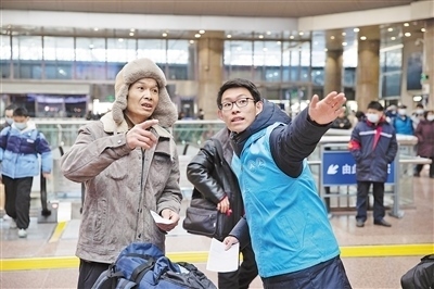 春運(yùn)首日,北京西站內(nèi),中國(guó)鐵路北京局志愿者為旅客進(jìn)行引導(dǎo)。本報(bào)記者 張武軍攝