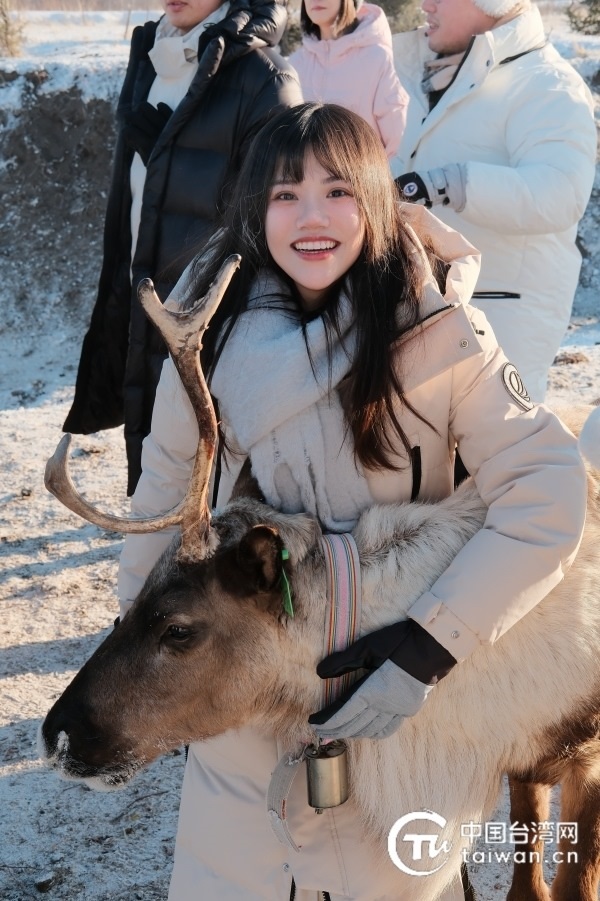 1月26日,2024年全國臺聯(lián)第三十屆臺胞青年冬令營內(nèi)蒙古分營一行人前往敖魯古雅鄂溫克民族鄉(xiāng),陳紀(jì)陵與馴鹿合影留念。(臺灣同學(xué) 王奕勛 攝)