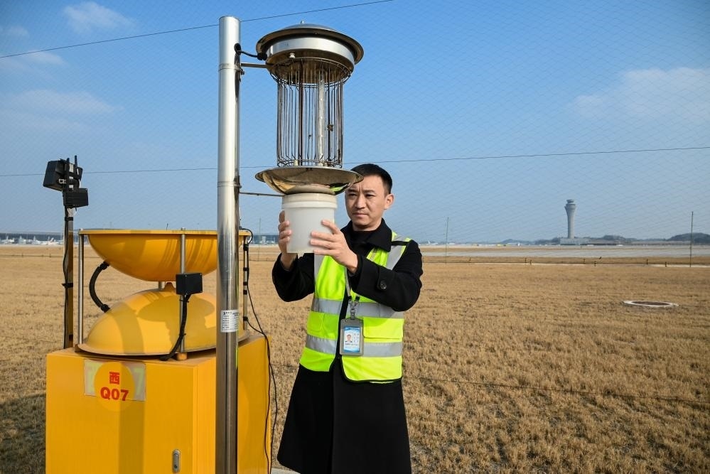 在成都天府國際機場,飛行區(qū)管理中心生態(tài)圍界管理室主管劉泰杉在維護驅(qū)鳥設(shè)施。(受訪者供圖)