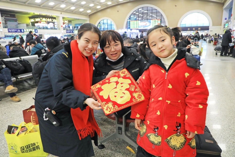 湖北武漢漢口火車站工作人員為候車旅客送“福”字(2月2日攝)。新華社發(fā)(邱晟 攝)