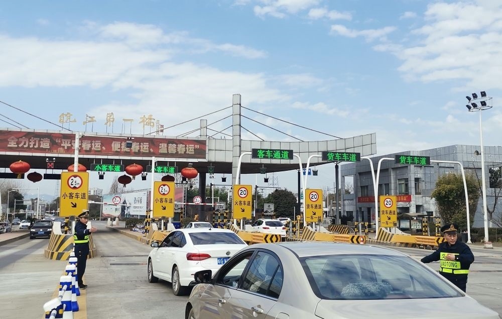 2月13日,安徽銅陵長江公路大橋管理處工作人員指揮引導(dǎo)車輛安全有序通行。新華社發(fā)(陶濤 攝)