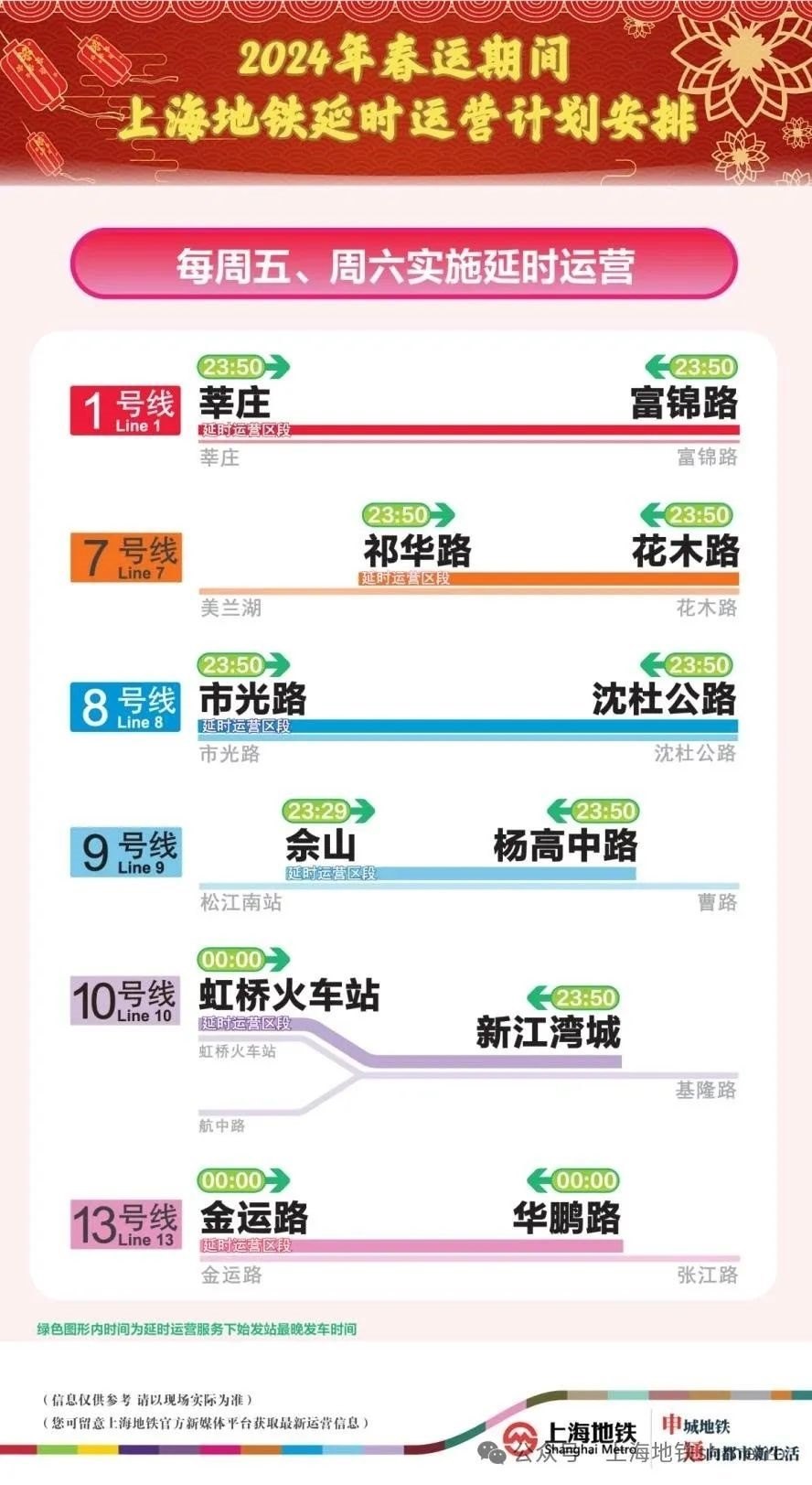 2月17日(周六),上海地鐵1、7、8、9、10、13號(hào)線(xiàn)繼續(xù)執(zhí)行常態(tài)周末延時(shí)運(yùn)營(yíng)方案,提請(qǐng)市民乘客注意末班車(chē)時(shí)間。