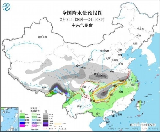2月23日8時(shí)至24日8時(shí),甘肅南部、陜西東南部、黃淮西部、江淮、江漢、江南北部、青海東南部、西藏東部和南部等地部分地區(qū)有小到中雪或雨夾雪,其中,西藏東南部等地局地有大到暴雪。西藏東南部、云南西北部等地部分地區(qū)有中到大雨。東海、南海、臺(tái)灣海峽有7~8級,陣風(fēng)9~10級的大風(fēng)。