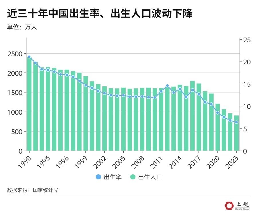 每年的出生人數(shù)也不斷下降,從1994年的2121萬人,降至1998年的1991萬人。