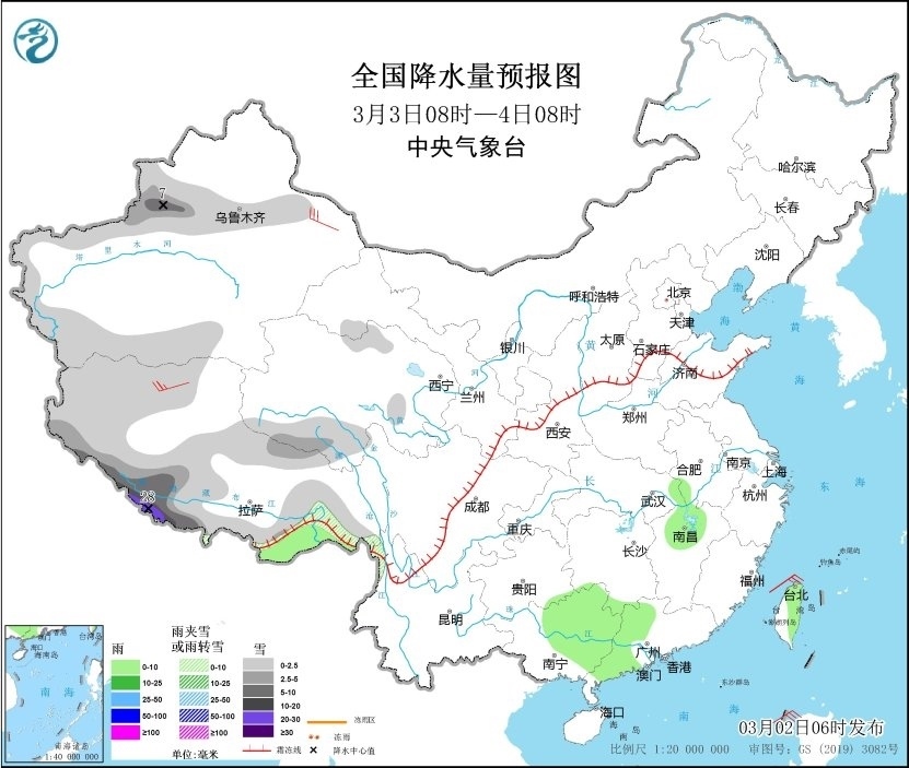3月3日08時(shí)至4日08時(shí),新疆南疆西部山區(qū)、伊犁河谷和沿天山地區(qū)、西藏大部、青海南部等地部分地區(qū)有小到中雪或雨夾雪,其中,新疆伊犁河谷、西藏西南部等地部分地區(qū)有大到暴雪,局地大暴雪(20~28毫米)。西藏東南部、湖北東部、湖南南部、江西北部、廣西中東部、廣東中西部、臺灣島大部等地部分地區(qū)有小雨。新疆東部、西藏等地有4~6級風(fēng)(見圖2)。黃海南部、東海中北部、臺灣海峽、南海北部、北部灣等地有4~5級風(fēng),陣風(fēng)6級。