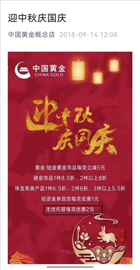 2018年,涉事門店的公眾號(hào)仍在宣傳無憂托管業(yè)務(wù),消費(fèi)者質(zhì)疑中國(guó)黃金方面,為何沒有發(fā)現(xiàn)這家店經(jīng)營(yíng)公司禁止的業(yè)務(wù)/受訪者供圖