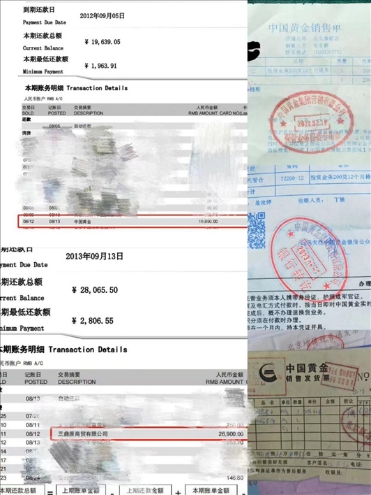 王鑫民:09年時(shí)候,他們跟順義那邊就有一個(gè)中國(guó)黃金店,就賣投資的黃金。我們想說買點(diǎn),將來自個(gè)老了以后能有一保證。他說,你要能寄存到這兒,還能給你點(diǎn)小禮品,我們想挺好的,你擱家多不安全,這么貴重的東西,我們就擱他那了,他給我們開單子。后來,順義這店搬到雙井去了,這是中國(guó)黃金的,而且商場(chǎng)更大,誰不都得放心。我們想跟他們也熟了,每年有點(diǎn)兒錢就買一點(diǎn)兒,還安全,還有點(diǎn)小獎(jiǎng)品,左一回買右一回買的,他店員都認(rèn)得我們了,挺熟的。他突然給我們打電話說:這出事了,你們趕緊過來。