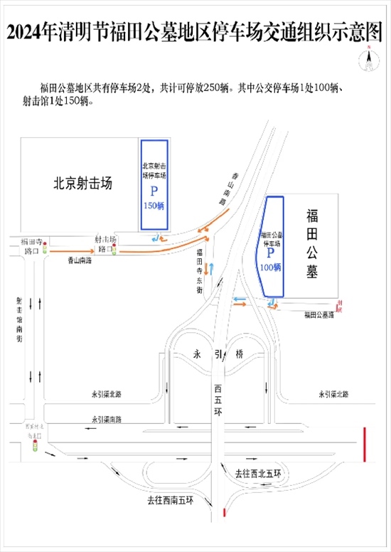 祭掃車輛可停放至公交停車場、老山南路路側停車場、雕塑公園西門停車場、原奧運場站停車場。祭掃高峰日,上莊大街路側允許臨時停車。