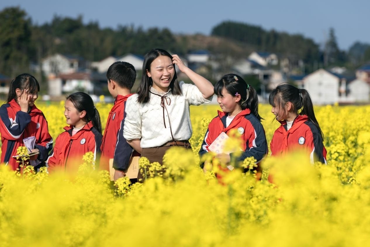 李柏霖不愿意讓孩子們覺得這樣的情緒是生活的全部。她把課堂搬到野外,在“搖搖花”開的時(shí)候帶孩子們?nèi)タ础皳u搖花”,油菜花開時(shí)去看油菜花。花也是詩,家鄉(xiāng)也是詩——若非如此,老師為什么走了又回呢?