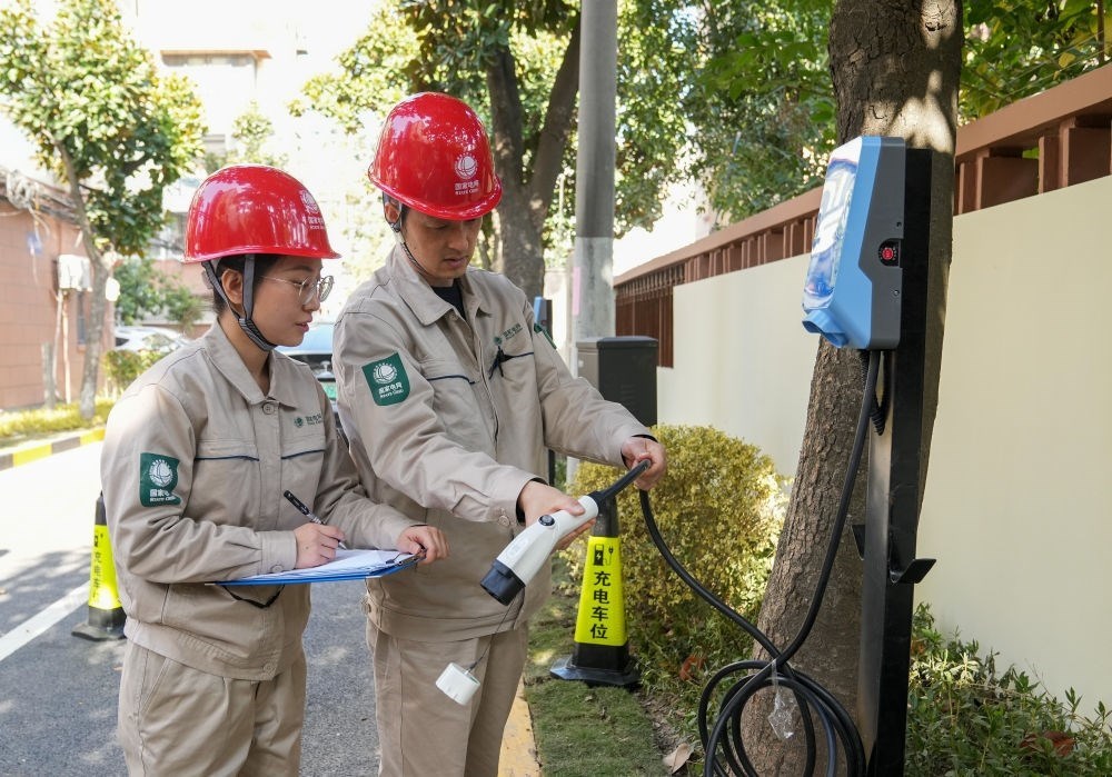2023年11月29日,在上海市徐匯區(qū)田林十三村小區(qū)內(nèi),國網(wǎng)上海市南供電公司的工作人員在檢查充電樁運行情況。新華社記者 丁汀 攝