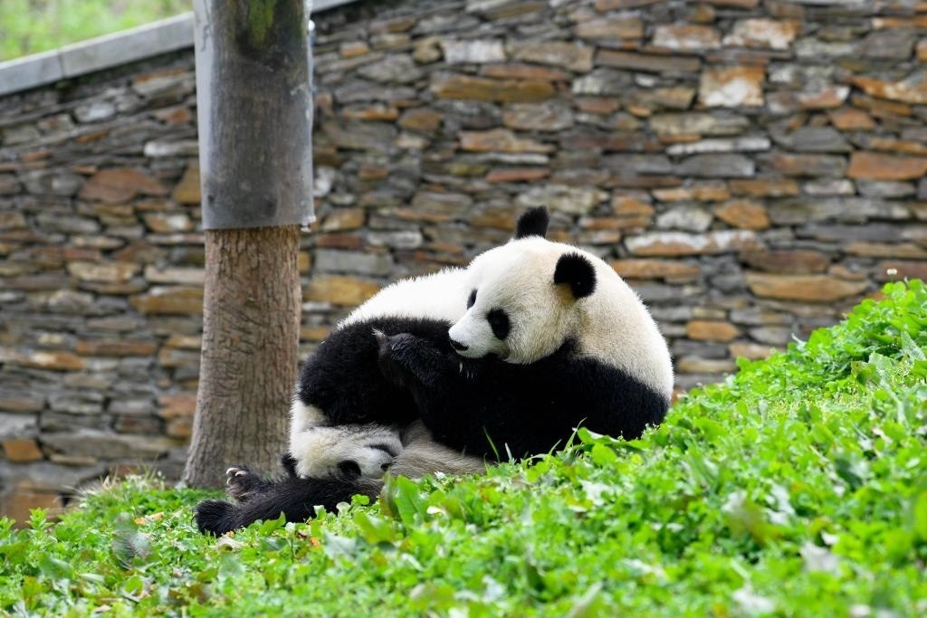 2022年4月24日,在中國大熊貓保護研究中心臥龍神樹坪基地內(nèi),一只大熊貓和大熊貓幼崽在玩耍。新華社記者 胥冰潔 攝