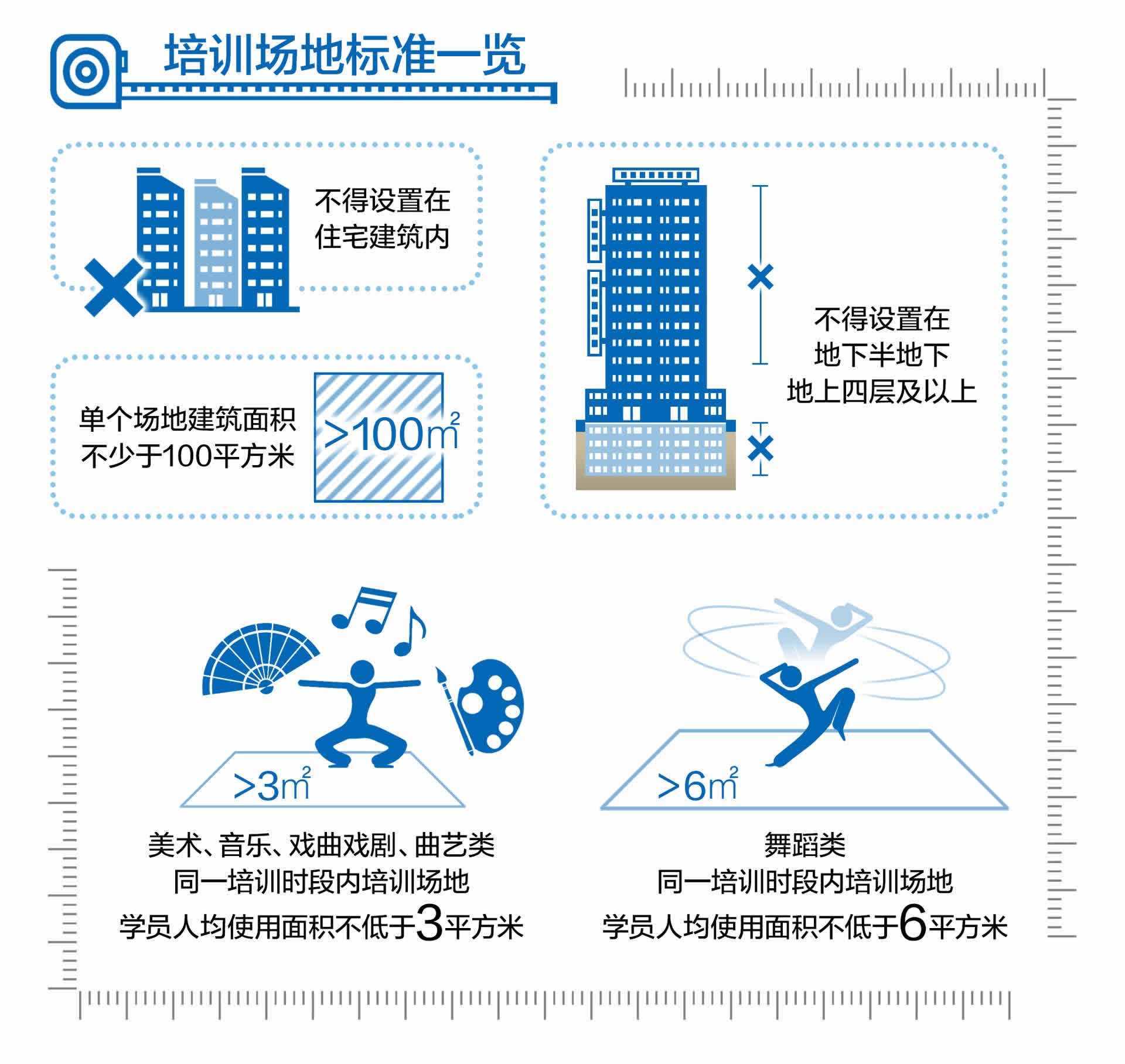 具體到店面內(nèi)部硬件,《標(biāo)準(zhǔn)》明確,開展培訓(xùn)教學(xué)的單個場地建筑面積應(yīng)不少于100平方米,美術(shù)、音樂、戲曲戲劇、曲藝類同一培訓(xùn)時段內(nèi)培訓(xùn)場地學(xué)員人均使用面積不低于3平方米,舞蹈類同一培訓(xùn)時段內(nèi)培訓(xùn)場地學(xué)員人均使用面積不低于6平方米,確保不擁擠、易疏散。