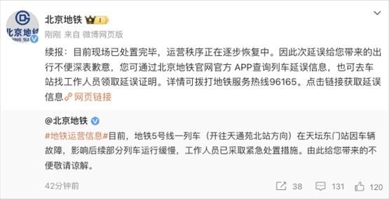 央視網(wǎng)消息:據(jù)@北京地鐵 微博消息,目前現(xiàn)場(chǎng)已處置完畢,運(yùn)營(yíng)秩序正在逐步恢復(fù)中。此前,北京地鐵發(fā)文稱,地鐵5號(hào)線一列車(開(kāi)往天通苑北站方向)在天壇東門站因車輛故障,影響后續(xù)部分列車運(yùn)行緩慢,工作人員已采取緊急處置措施。