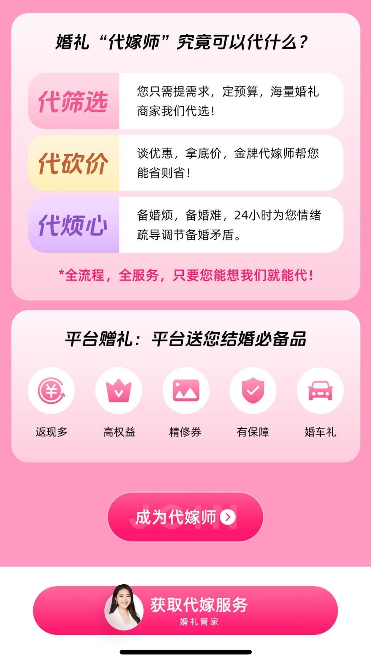 該頁面還宣傳稱,代嫁師可以“代篩選”“代砍價”“代煩心”,并且還有一行字強(qiáng)調(diào):“全流程,全服務(wù),只要您能想,代嫁師就能代。”