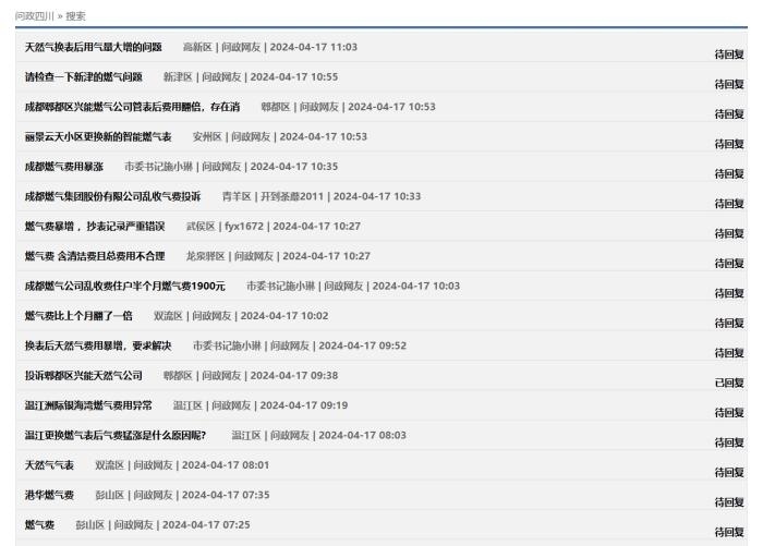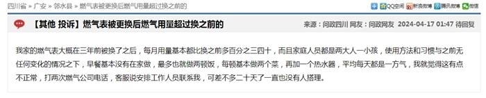 中新網(wǎng)4月17日電(中新財(cái)經(jīng)記者 吳濤)近日,在“問(wèn)政四川”平臺(tái)上,不少網(wǎng)友反映“更換新表后燃?xì)赓M(fèi)異常上漲”,這些留言顯示來(lái)自四川成都、自貢、廣安、南充等多地,僅僅在4月16日,保守估計(jì)就有十幾條;17日上午又出現(xiàn)十幾條。大部分尚未得到回復(fù),部分獲得官方回復(fù)稱“留言已轉(zhuǎn)交給相關(guān)機(jī)構(gòu)進(jìn)行處理”。