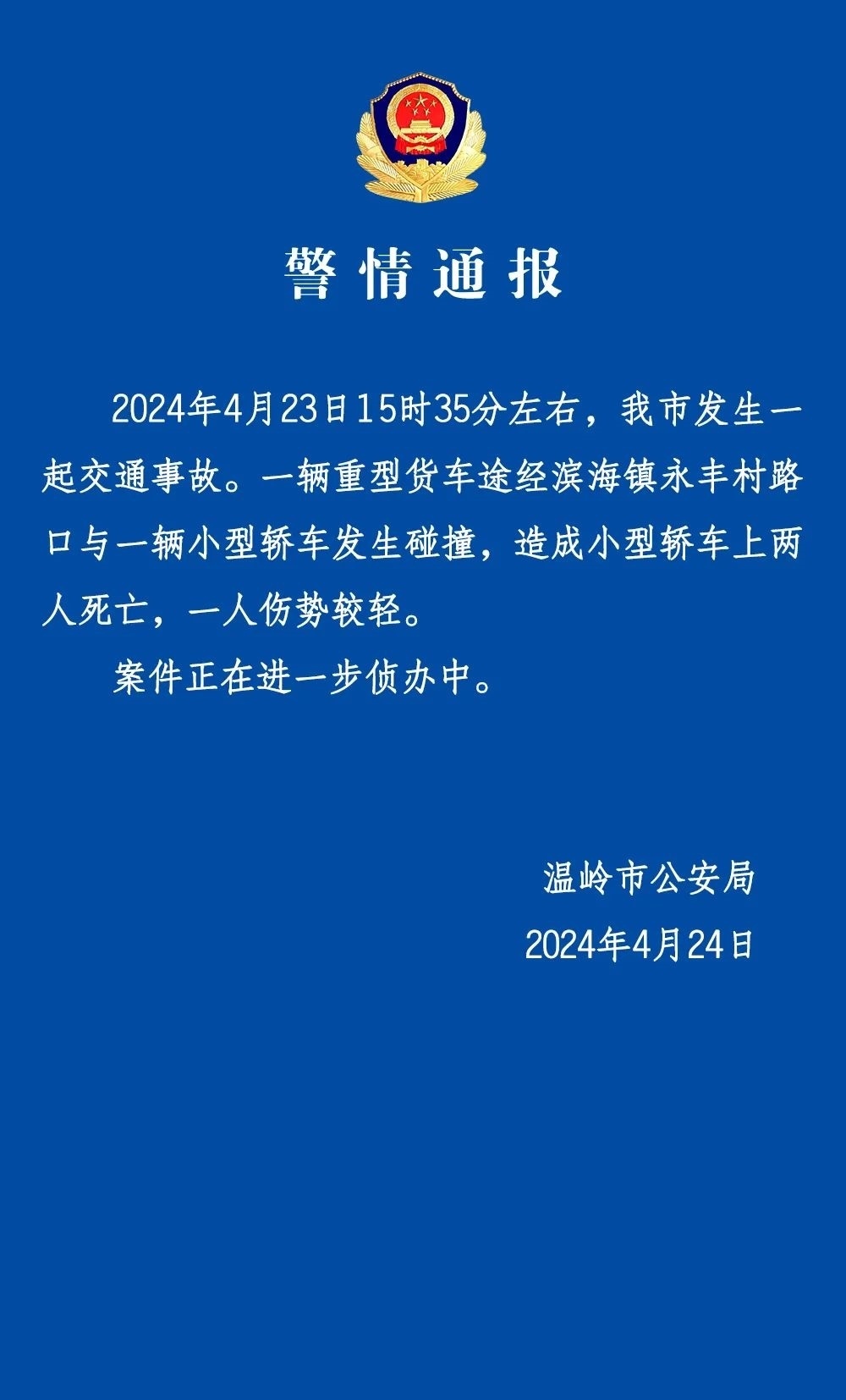 央視網(wǎng)消息:溫嶺市公安局4月24日發(fā)布警情通報(bào):2024年4月23日15時(shí)35分左右,我市發(fā)生一起交通事故。一輛重型貨車途經(jīng)濱海鎮(zhèn)永豐村路口與一輛小型轎車發(fā)生碰撞,造成小型轎車上兩人死亡,一人傷勢(shì)較輕。