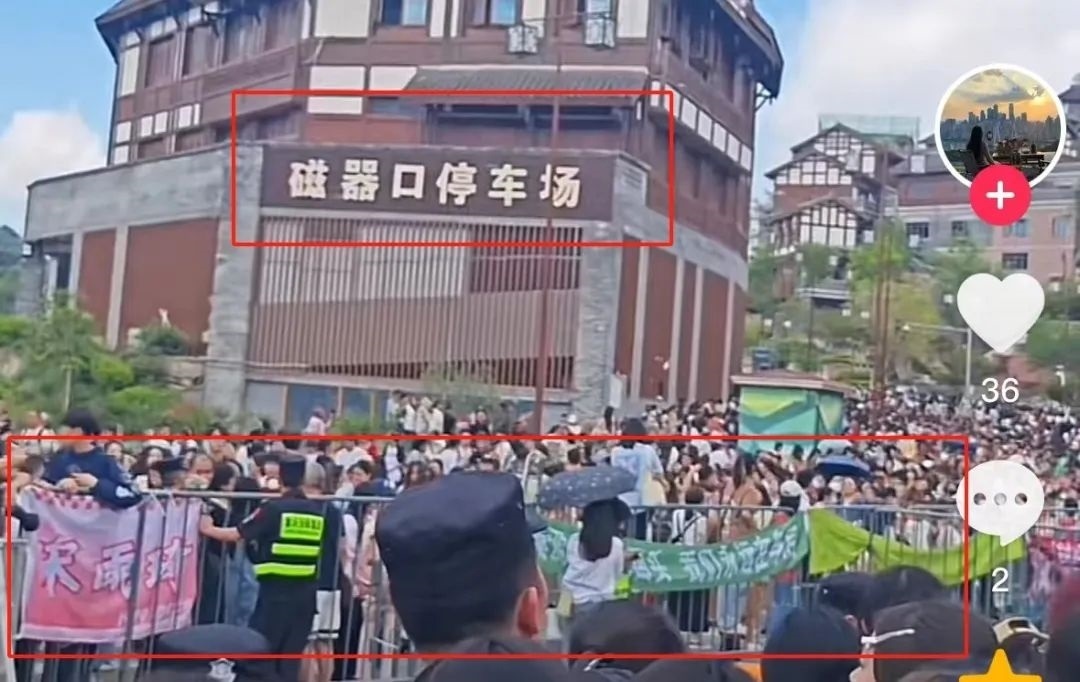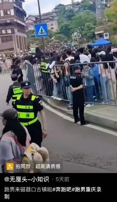 根據(jù)視頻顯示的“磁器口停車場”檢索視頻平臺相關(guān)內(nèi)容,有不少網(wǎng)友在4月19日發(fā)布了綜藝節(jié)目《奔跑吧》在當(dāng)?shù)劁浿茣r(shí)的畫面,通過比對可以發(fā)現(xiàn),網(wǎng)傳視頻中出現(xiàn)的圍欄、安保分布情況、以及圍欄上懸掛的不同顏色應(yīng)援橫幅等元素都與路人拍攝的清晰版視頻一致。