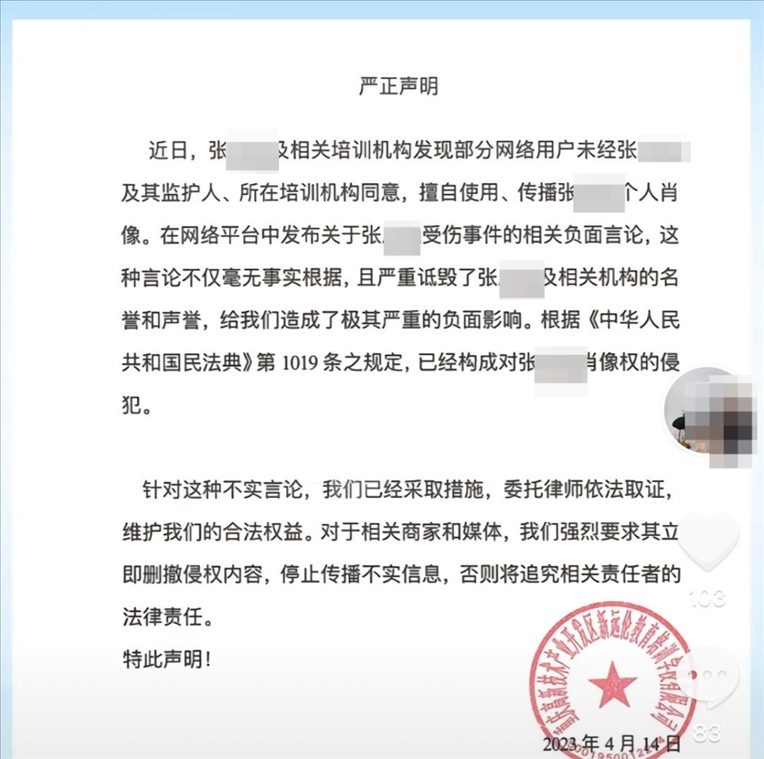 紅星新聞注意到,遠(yuǎn)倫舞蹈帳號(hào)2023年2023年4月曾發(fā)布一則聲明。落款為重慶高新技術(shù)產(chǎn)業(yè)開(kāi)發(fā)區(qū)新遠(yuǎn)倫教育培訓(xùn)學(xué)校有限公司(下稱(chēng)遠(yuǎn)倫培訓(xùn)學(xué)校)。聲明稱(chēng),近日,張某涵及相關(guān)培訓(xùn)機(jī)構(gòu)發(fā)現(xiàn)部分網(wǎng)絡(luò)用戶未經(jīng)張某涵及其監(jiān)護(hù)人、所在培訓(xùn)機(jī)構(gòu)同意,擅自使用、傳播張某涵個(gè)人肖像。在網(wǎng)絡(luò)平臺(tái)中發(fā)布關(guān)于受傷事件的相關(guān)負(fù)面言論,這種言論不僅毫無(wú)事實(shí)根據(jù),且嚴(yán)重詆毀了張某涵及相關(guān)機(jī)構(gòu)的名譽(yù)和聲譽(yù),給公司造成了極其嚴(yán)重的負(fù)面影響,已經(jīng)構(gòu)成對(duì)張某涵肖像權(quán)的侵犯。