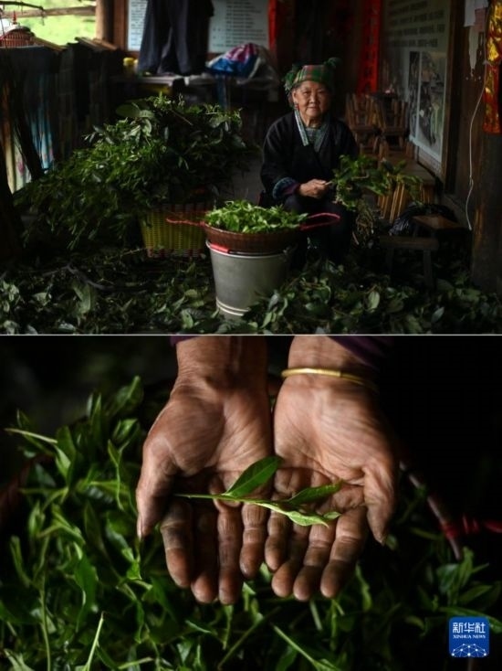 在廣西柳州市融水苗族自治縣桿洞鄉(xiāng)黨鳩村,72歲的梁妹花老人在整理剛剛采摘的茶葉(4月11日攝,拼版照片)。油茶是當?shù)氐膫鹘y(tǒng)飲品,梁妹花每天都要打油茶。