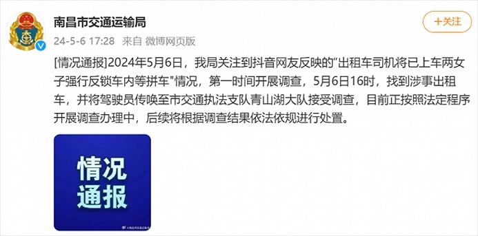 ·網(wǎng)友稱出租車司機(jī)將兩女子反鎖車內(nèi)等拼車,南昌市交通運(yùn)輸局回應(yīng)。