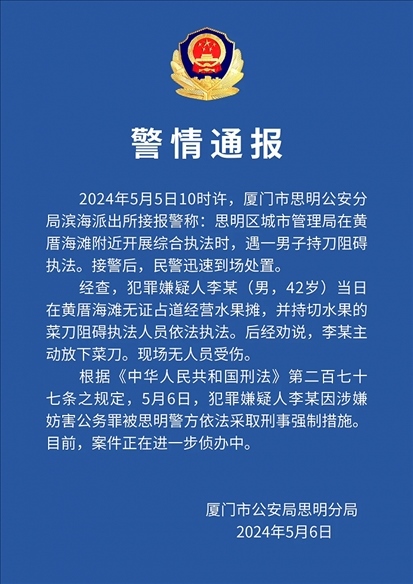 ·廈門警方:無(wú)證占道經(jīng)營(yíng)還持刀阻礙執(zhí)法,一男子被采取刑事強(qiáng)制措施。