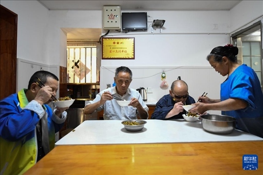 5月13日,在出發(fā)前往周年慶前,張世維(左一)和協(xié)會會員在家里吃早飯。新華社記者 胥冰潔 攝
