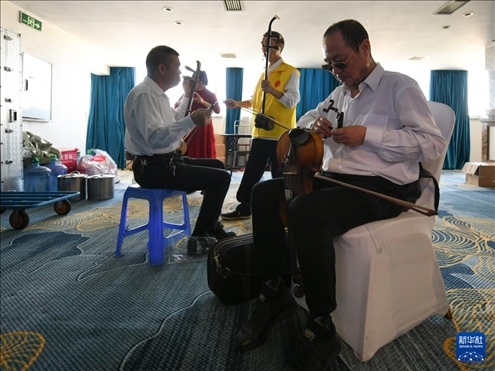 5月13日,“自強不息藝術(shù)團盲人樂隊”成員準(zhǔn)備登臺演出。新華社記者 胥冰潔 攝