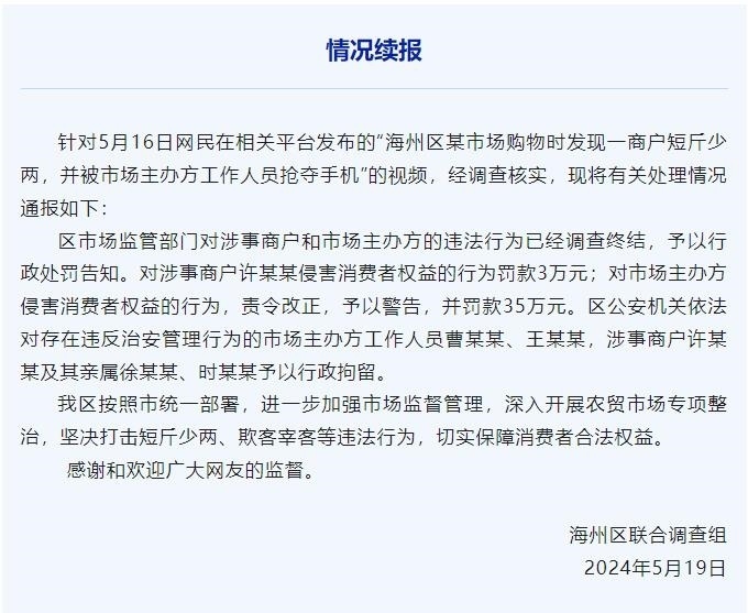 央視網(wǎng)消息:據(jù)“今日海州”微信公眾號(hào)消息,針對(duì)5月16日網(wǎng)民在相關(guān)平臺(tái)發(fā)布的“海州區(qū)某市場(chǎng)購(gòu)物時(shí)發(fā)現(xiàn)一商戶短斤少兩,并被市場(chǎng)主辦方工作人員搶奪手機(jī)”的視頻,經(jīng)調(diào)查核實(shí),現(xiàn)將有關(guān)處理情況通報(bào)如下:區(qū)市場(chǎng)監(jiān)管部門對(duì)涉事商戶和市場(chǎng)主辦方的違法行為已經(jīng)調(diào)查終結(jié),予以行政處罰告知。對(duì)涉事商戶許某某侵害消費(fèi)者權(quán)益的行為罰款3萬(wàn)元;對(duì)市場(chǎng)主辦方侵害消費(fèi)者權(quán)益的行為,責(zé)令改正,予以警告,并罰款35萬(wàn)元。區(qū)公安機(jī)關(guān)依法對(duì)存在違反治安管理行為的市場(chǎng)主辦方工作人員曹某某、王某某,涉事商戶許某某及其親屬徐某某、時(shí)某某予以行政拘留。
