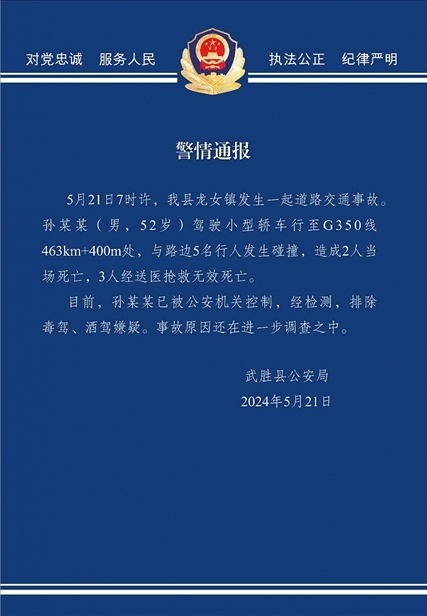央視網(wǎng)消息:據(jù)平安武勝微信公眾號(hào)消息,5月21日7時(shí)許,武勝縣龍女鎮(zhèn)發(fā)生一起道路交通事故,孫某某(男,52歲)駕駛小型轎車行至G350線463km+400m處,與路邊5名行人發(fā)生碰撞,造成2人當(dāng)場(chǎng)死亡,3人經(jīng)送醫(yī)搶救無效死亡。目前,孫某某已被公安機(jī)關(guān)控制,經(jīng)檢測(cè),排除毒駕、酒駕嫌疑。事故原因還在進(jìn)一步調(diào)查之中。
