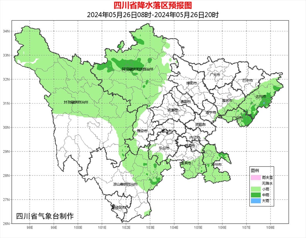 明天白天:盆地大部多云間晴,其中達(dá)州、廣安、瀘州3市有陣雨或雷雨;阿壩州大部、甘孜州北部東部、涼山州東北部多云間陰有分散陣雨或雷雨,其中阿壩州北部有中雨,甘孜州和攀西地區(qū)的其余地方多云間晴。