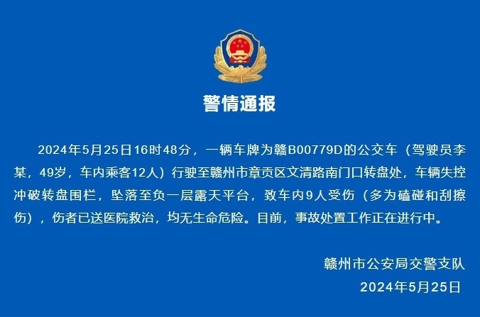 央視網(wǎng)消息:據(jù)贛州公安微信公眾號消息,2024年5月25日16時48分,一輛車牌為贛B00779D的公交車(駕駛員李某,49歲,車內(nèi)乘客12人)行駛至贛州市章貢區(qū)文清路南門口轉(zhuǎn)盤處,車輛失控沖破轉(zhuǎn)盤圍欄,墜落至負(fù)一層露天平臺,致車內(nèi)9人受傷(多為磕碰和刮擦傷),傷者已送醫(yī)院救治,均無生命危險。目前,事故處置工作正在進(jìn)行中。