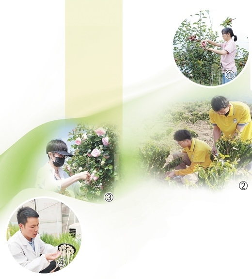 圖①:劉丹丹在調(diào)查蘋果病害情況。 圖②:咖啡團(tuán)隊的學(xué)生們在咖啡田地里進(jìn)行花芽分化調(diào)查。 圖③:周寧寧在進(jìn)行月季雜交授粉。 圖④:雷貴杰在觀察水稻根系的生長狀況。以上圖片均為受訪者提供
