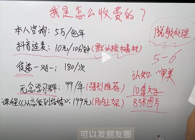 此外,不少婚戀軍師都公開了聯(lián)系方式,通過提供一對一指導、付費視頻、情感課程、收徒、經(jīng)營朋友圈教學等形式斂金,且價格不菲。