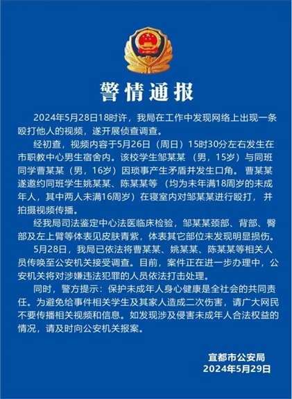 ·湖北宜都警方通報(bào)男生遭多名同學(xué)毆打并被拍視頻。