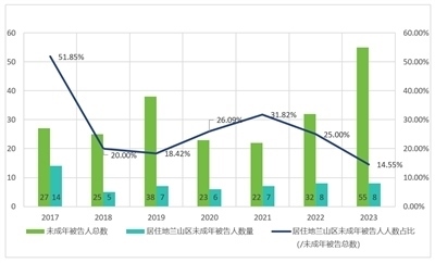 圖二:2017年至2023年蘭山區(qū)未成年人犯罪案件人數(shù)比例變化情況