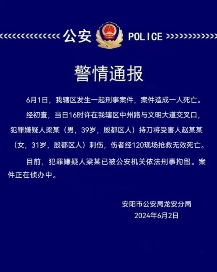 央視網(wǎng)消息:河南安陽市公安局龍安分局6月2日發(fā)布警情通報(bào):6月1日,轄區(qū)發(fā)生一起刑事案件,案件造成一人死亡。經(jīng)初查,當(dāng)日16時(shí)許在轄區(qū)中州路與文明大道交叉口,犯罪嫌疑人梁某 (男,39歲,殷都區(qū)人)持刀將受害人趙某某(女,31歲,殷都區(qū)人)刺傷,傷者經(jīng)120現(xiàn)場搶救無效死亡。目前,犯罪嫌疑人梁某已被公安機(jī)關(guān)依法刑事拘留。案件正在偵辦中。