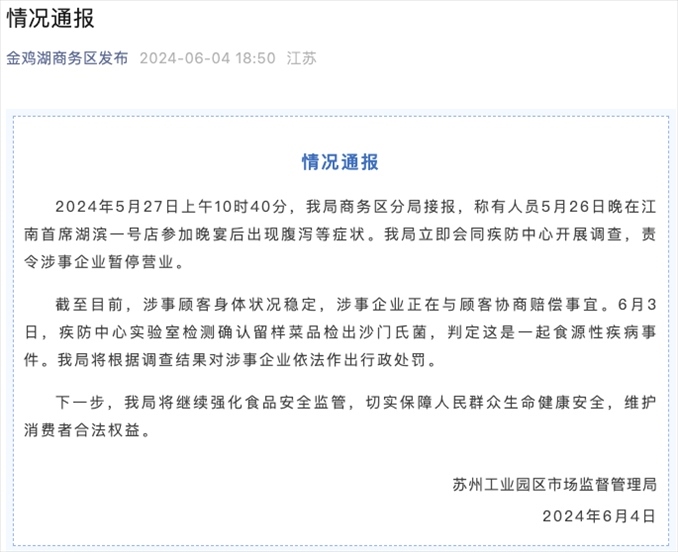 央視網(wǎng)消息:據(jù)蘇州工業(yè)園區(qū)市場(chǎng)監(jiān)督管理局通報(bào),5月27日上午10時(shí)40分,商務(wù)區(qū)分局接報(bào),稱有人員5月26日晚在江南首席湖濱一號(hào)店參加晚宴后出現(xiàn)腹瀉等癥狀。該局立即會(huì)同疾防中心開展調(diào)查,責(zé)令涉事企業(yè)暫停營業(yè)。
