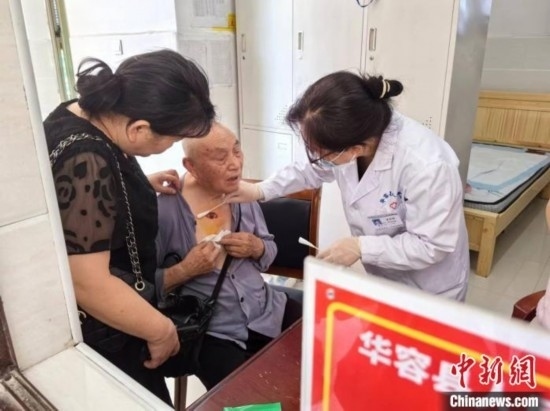 湖南華容縣人民醫(yī)院醫(yī)生正在給剛剛轉移到安置點的鮑松柏老人治療。中新網記者 白祖偕 攝