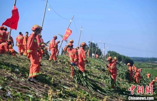 消防人員正在清除間堤的雜草和雜物。中新網記者 楊華峰 攝