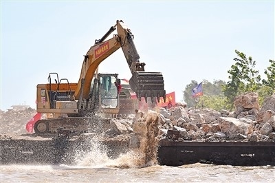 在湖南省岳陽市華容縣團(tuán)洲垸洞庭湖大堤決口現(xiàn)場(chǎng),搶險(xiǎn)隊(duì)伍在進(jìn)行堵口作業(yè)。新華社記者 陳振海攝