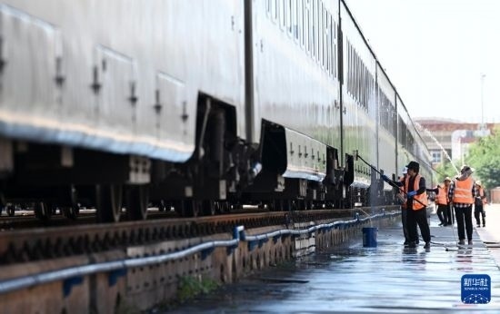 7月17日,工作人員在洗刷列車。